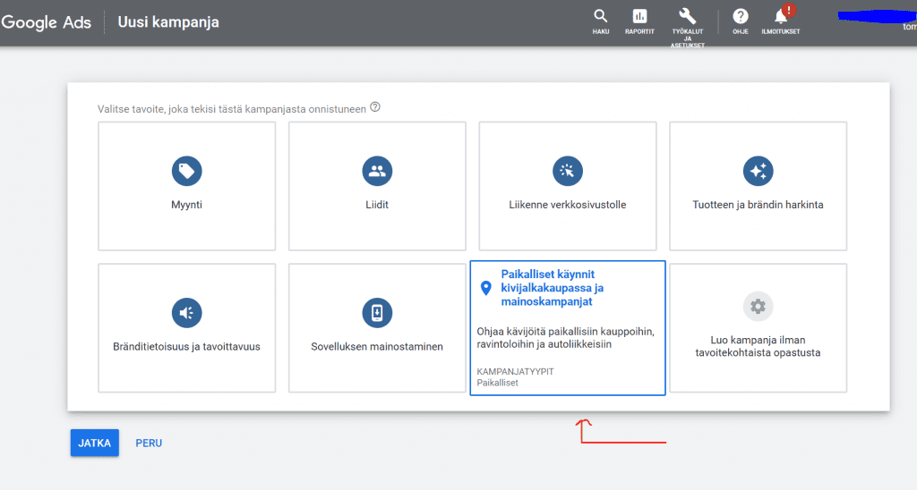 3. Valitse kampanjavalikosta "paikalliset käynnit kivijalkakaupassa".