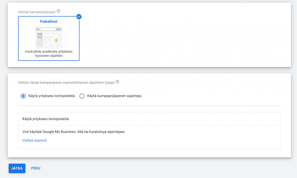 Paikallisten kampanjoiden on tarkoitus olla helppokäyttöisiä ja keskittyä liiketoiminnan offline-tavoitteiden saavuttamiseen. Sinä kerrot Googlelle kauppojesi sijainnit, määrittelet kampanjalle budjetin ja mainosten sisällöt. Näiden tietojen avulla Googlen tekoäly optimoi muun. Koneoppiminen hoitaa hintatarjoukset, mainosten sijoittelun ja sisältöjen yhdistelmät täysin automaattisesti.