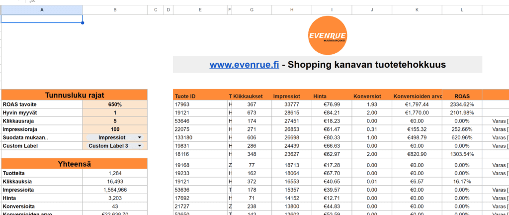 Google Ads -scripti ja Google Sheets -taulukon yhdistelmä, tekee tuotteidesi tehokkuuden analysoinnista ja optimoinnista vaivatonta.